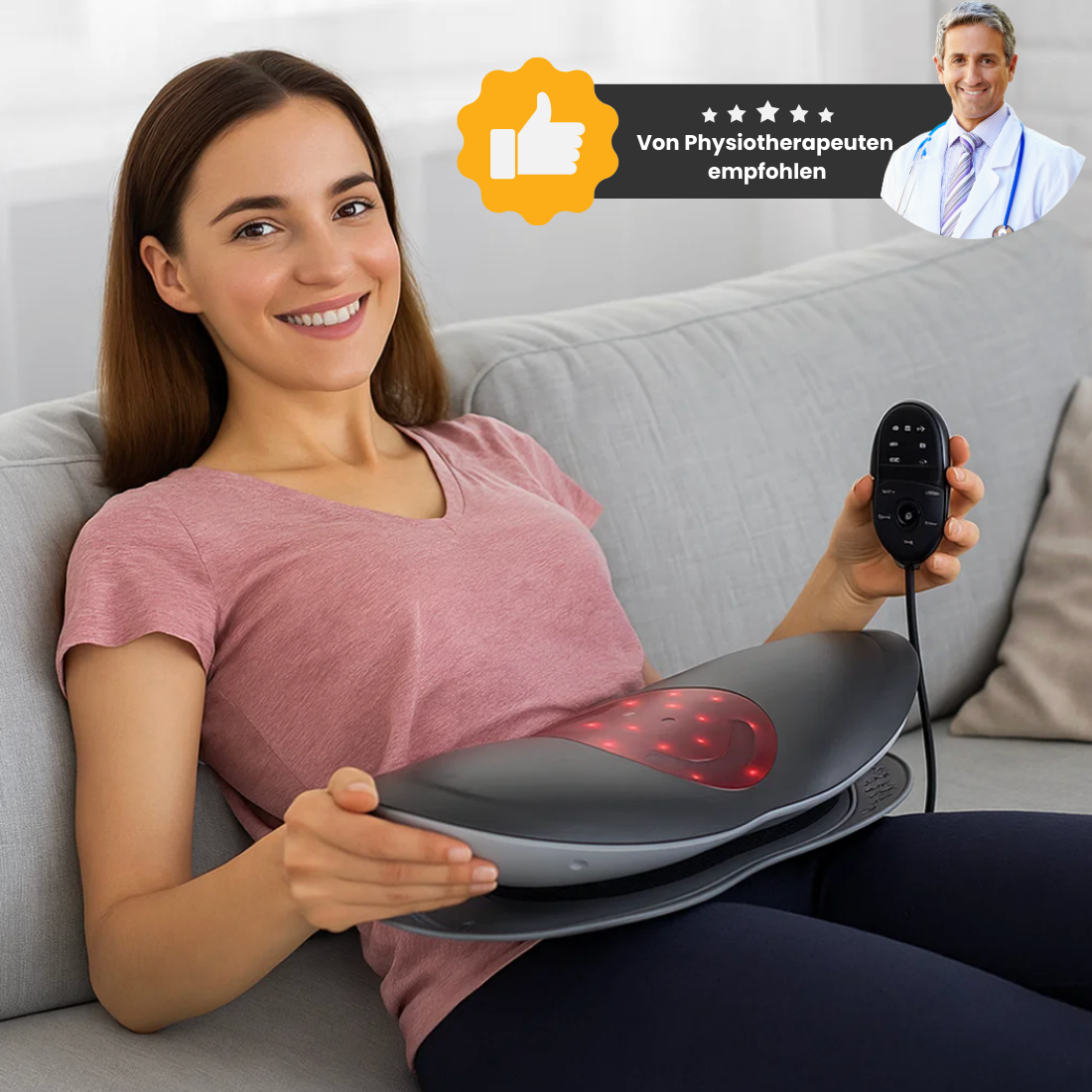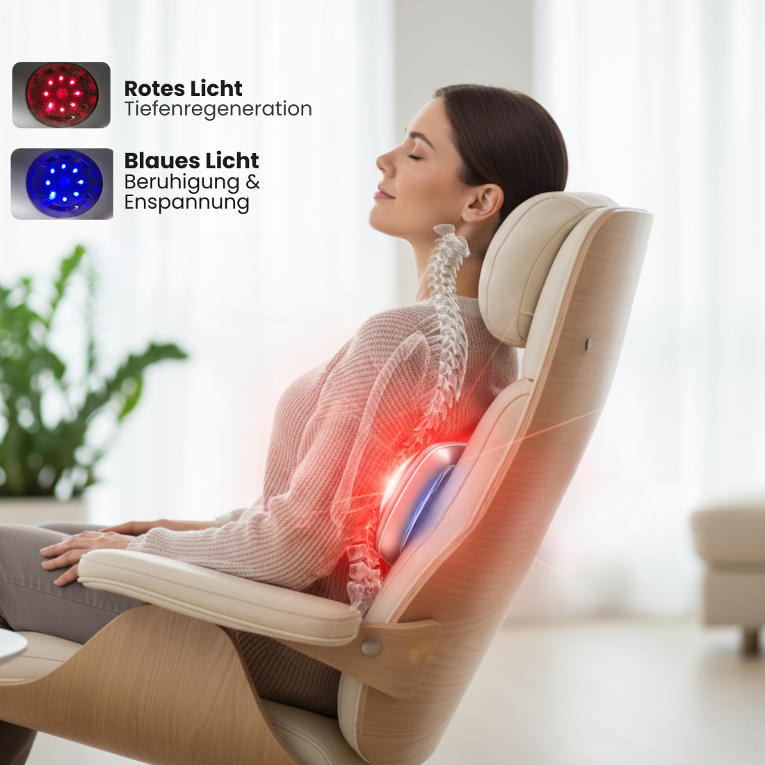Viele Anwender berichten deutlich von spürbarer Entlastung und weniger ausstrahlenden Schmerzen. TheraBack Pro™ wirkt auf mehreren Ebenen gleichzeitig — sanfte Traktion nimmt Druck von den Bandscheiben und Nerven, Tiefenwärme löst verhärtete Muskulatur und verbessert die Durchblutung, und Rot/NIR-Licht unterstützt die zelluläre Regeneration.